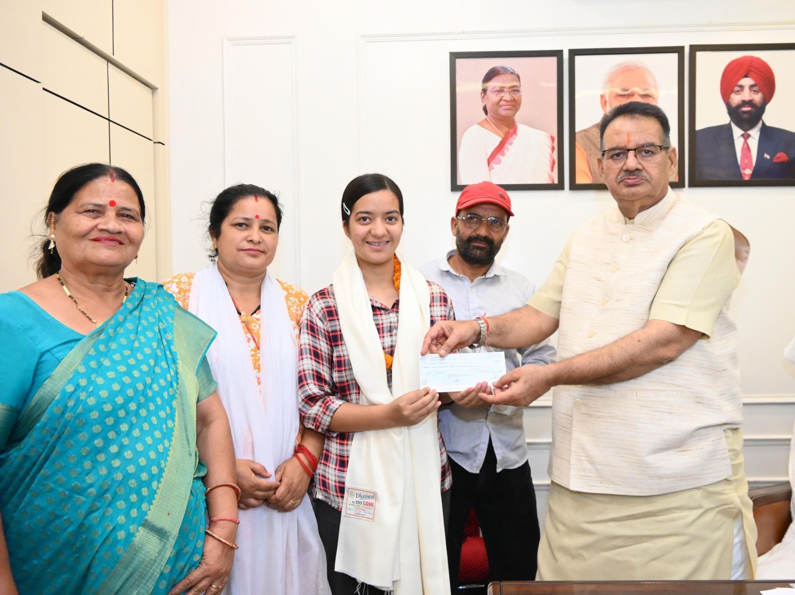 कैबिनेट मंत्री गणेश जोशी ने आज कैंप कार्यालय में पीएम  केंद्रीय विद्यालय हाथीबड़कला की मेधावी छात्रा हिमाद्रि माहरा को सम्मानित किया। हिमाद्रि ने 12वीं कक्षा की परीक्षा में 99.2% अंक प्राप्त कर विद्यालय में प्रथम स्थान प्राप्त किया। इस उपलब्धि पर मंत्री गणेश जोशी ने छात्रा को 5100 रुपए  की प्रोत्साहन राशि का चेक प्रदान कर सम्मानित किया। इस अवसर पर मंत्री जोशी ने हिमाद्रि और उनके परिजनों को बधाई देते हुए उनके उज्ज्वल भविष्य की कामना की। हिमाद्रि के पिता भगवान सिंह एक निजी संस्था में कार्यरत हैं, जबकि उनकी माता हेमा माहरा गृहिणी हैं। मंत्री जोशी ने कहा कि हिमाद्रि की सफलता न सिर्फ उनके परिवार बल्कि पूरे उत्तराखंड के लिए गर्व की बात है।