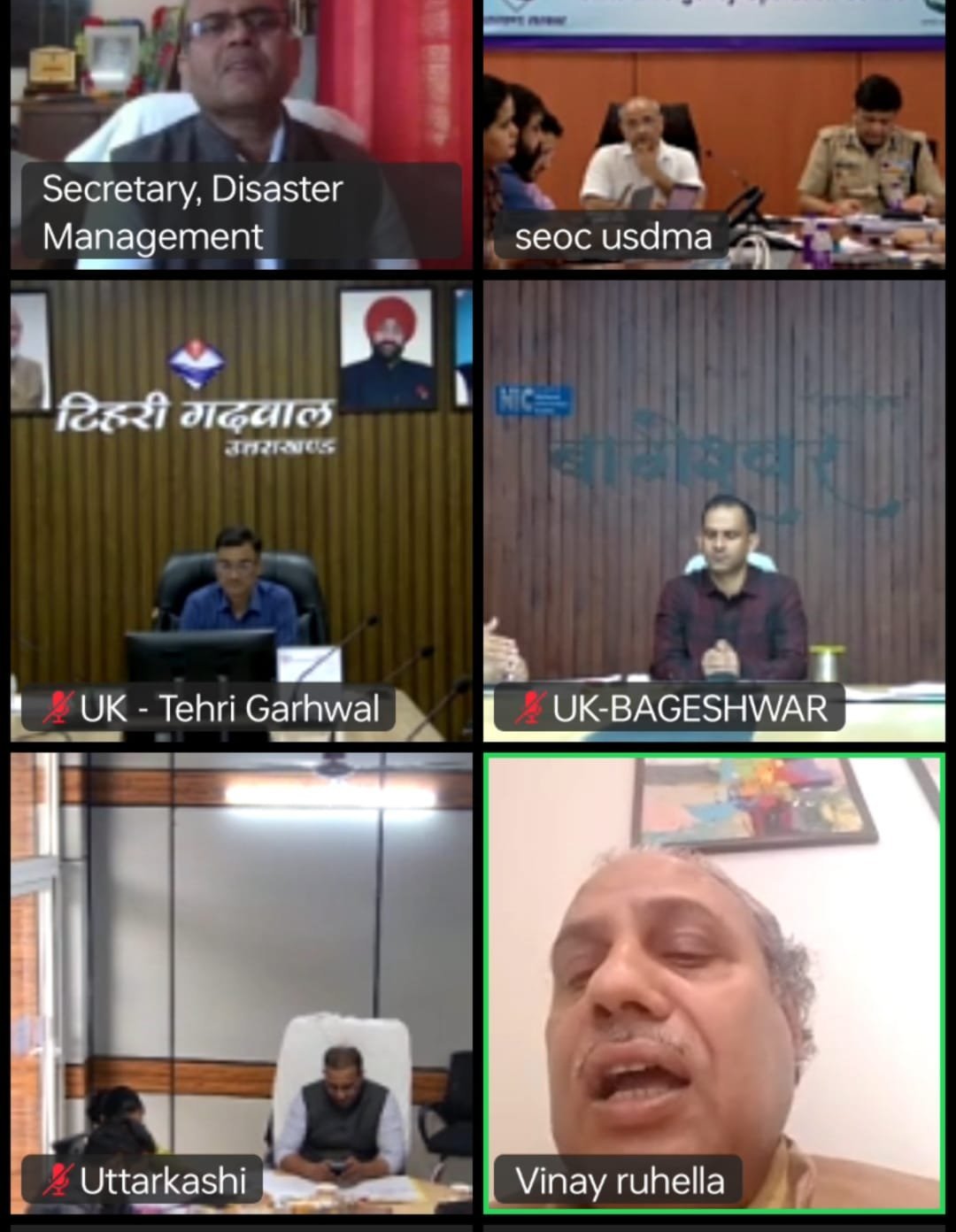 उन्होंने सभी जिलाधिकारियों को निर्देश दिए कि आपदा प्रबंधन के दृष्टिकोण से सभी जनपदों में हर रोज समीक्षा बैठक की जाए। साथ ही स्कूली तथा कॉलेज के छात्र-छात्राओं, के साथ ही व्यापारियों का भी वाट्सएप गु्रप बनाया जाए। इस अवसर पर एसीईओ प्रशासन/अपर सचिव आनंद स्वरूप, एसीईओ क्रियान्वयन डीआईजी राजकुमार नेगी, पूजा राणा, रोहित कुमार, हेमंत बिष्ट, वेदिका पन्त, तंद्रीला सरकार आदि मौजूद थे।
