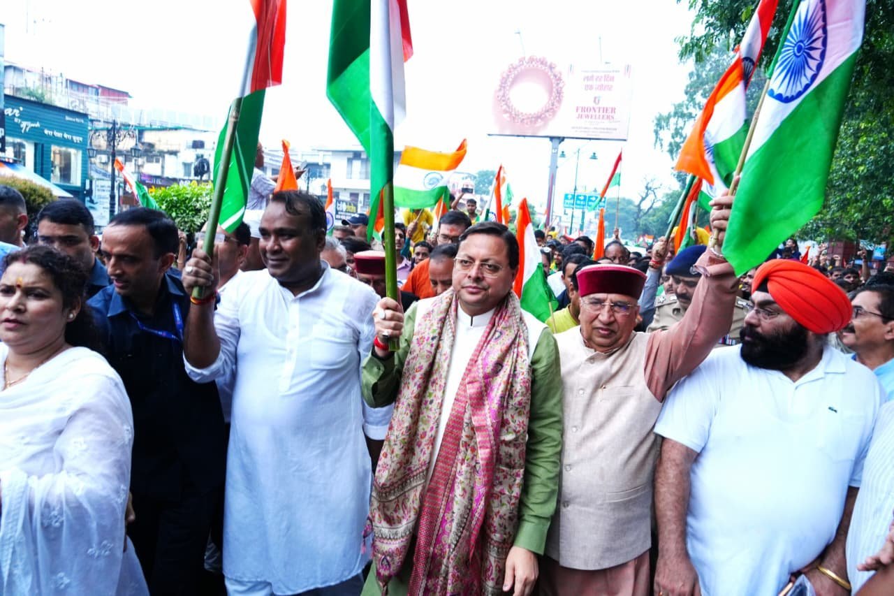 सीएम धामी ने बुधवार को गाँधी पार्क, देहरादून से जनप्रतिनिधियों, हजारों की संख्या में युवाओं, छात्र – छात्राओं, महिलाओं एवं बच्चों के साथ हाथ में तिरंगा लेकर ‘भारत मां की जयकार, वंदे मातरम’ की गूंज के साथ तिरंगा यात्रा का नेतृत्व किया। सीएम ने उपस्थित लोगों का उत्साहवर्धन किया, विशेषकर युवाओं का हौसला बढ़ाया | उन्होंने ‘हर घर तिरंगा’ अभियान (13-15 अगस्त) का शुभारंभ भी किया। राष्ट्रभक्ति के गीतों की धुनों के बीच मुख्यमंत्री ने तिरंगा यात्रा का नेतृत्व किया। सीएम ने युवाओं का अभिनंदन करते हुए सभी को स्वतंत्रता दिवस की अग्रिम शुभकामनाएं भी दी। तिरंगा यात्रा को देख लग रहा था कि देहरादून की सड़कों पर समूचा भारत उमड़ पड़ा है।