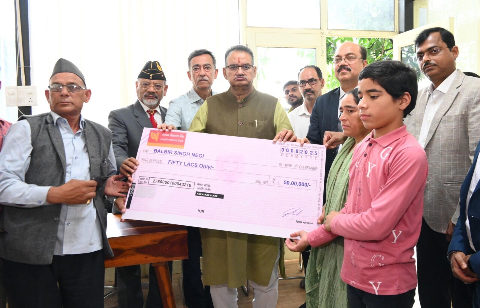 सैनिक कल्याण मंत्री गणेश जोशी ने देहरादून स्थित कैम्प कार्यालय में उपनल के माध्यम से विद्युत विभाग के कार्य करने वाले उपनल कर्मचारी धनवीर सिंह नेगी की आकस्मात मृत्यु होने पर उपनल और पंजाब नेशनल बैंक के बीच हुए करार के क्रम में 50 लाख की धनराशि का चैक मृतक के पिता बलवीर सिंह नेगी तथा उनकी पत्नी मंगीता नेगी का सौंपा। इस दौरान काबीना मंत्री सहित कार्यक्रम में उपस्थित सभी लोगों ने धराली में आयी प्राकृतिक आपदा के दिवंगतजनों को दो मिनट का मौन रखकर श्रद्धांजलि दी और घायल व्यक्तियों के शीघ्र स्वास्थ्य लाभ की कामना की।